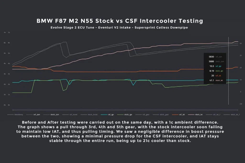 Este intercooler de gran volumen CSF se instala sin modificación como reemplazo directo del original en los motores N55 de los BMW M2 F87 / 135i / 235i F2x y 335i / 435i F3x. Desarrollado con un núcleo de tipo bar & plate, este intercambiador de alta capacidad es capaz de reducir considerablemente las temperaturas de admisión, soportar niveles de potencia elevados y presenta un acabado negro tan discreto como elegante.