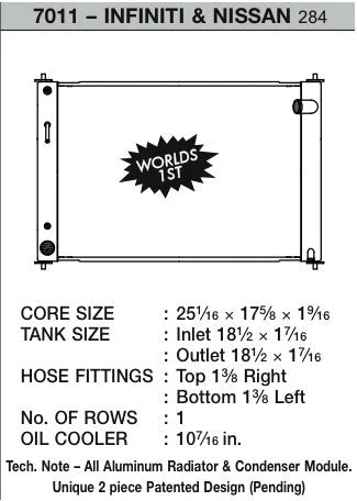 Específicamente diseñado para un montaje directo en los Nissan 370Z (Auto), este radiador de gran volumen CSF Race está fabricado en aluminio de alta calidad, con una estructura “dual core” de 42mm y conexiones B-tube. Destinado a optimizar la refrigeración de los motores VQ37, tanto en carretera como en pista, este radiador de alto rendimiento es compatible con todo tipo de líquido refrigerante y manguitos.
